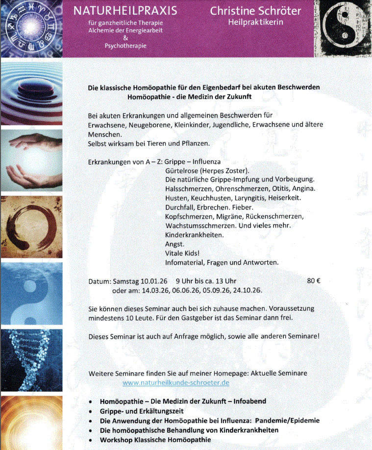 Weiterbildung: Bei akuten Erkrankungen und allgemeinen Beschwerden für Erwachsene und Kinder / Erkrankungen von A – Z, Grippe, COVID 19 und Mutationen. Angst. Infomaterial.